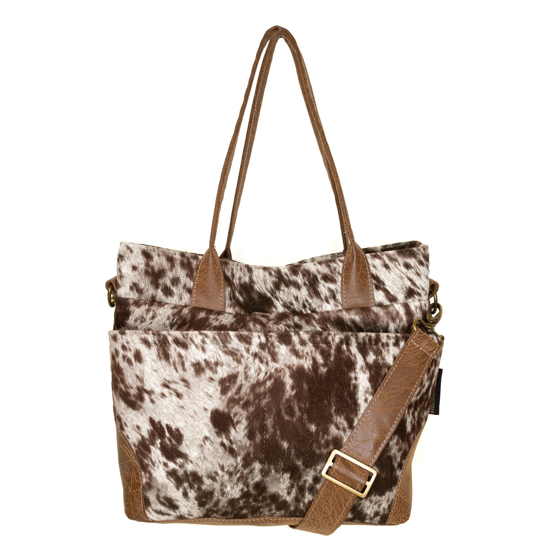 • faux leather base, shoulder straps, and adjustable crossbody strap