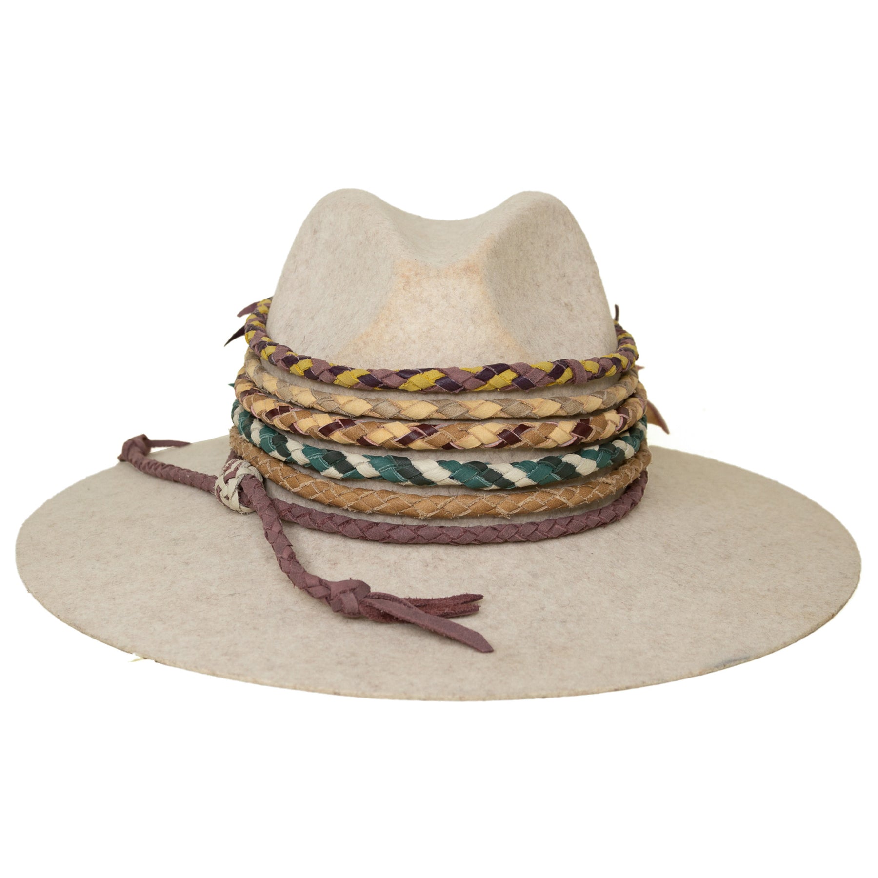 Take your hat from a basic accessory to a statement piece with our genuine leather braided hat bands! Each band is hand made by Rebekah's dad, Bud Eggers, who has over 40 years of braiding experience.  They are the perfect add-on for your cowboy hat, felt hat, straw hat or fedora. The band will adjust to fit your hat using a braided knot.